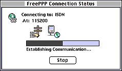 You should see that the modem is dialing, establishing communication, sending your password, and finally that you have connected and the window will disappear.