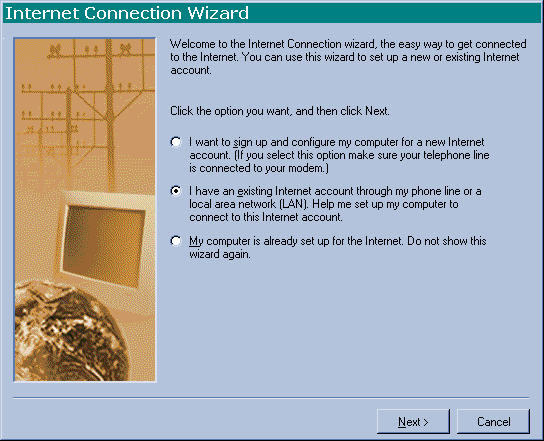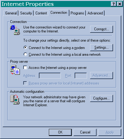 Click on the Start menu, then Settings, then Control Panel. After Control Panel opens, double-click on Internet, or Internet Options. The image is what Internet Properties looks like. Click on the Connection tab at the top, then press the Connect button to load the Internet Connection Wizard.