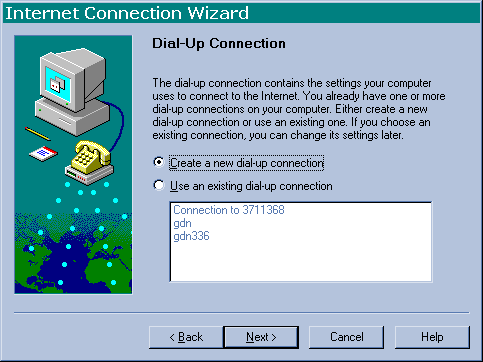 Select the first option, Create a new dial-up connection, regardless of what is in the box in the bottom of the screen. Most users will not have anything in that screen anyway. Once you have selected the first button, click Next.