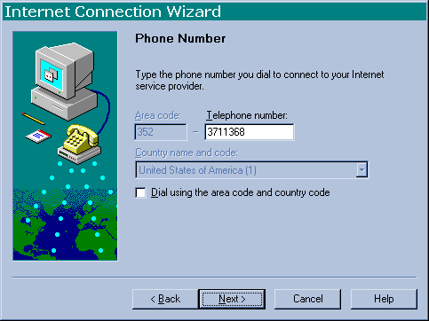 Remove the check mark from Dial using the area code, then type in our phone number into the Telephone number field. Since you are calling a local number, the area code is irrelevant and can lead to unnessesary long-distance dialing. The number for our 33.6k service is 371-1368 and our 56k number is 377-7997. When you are finished, click Next. |