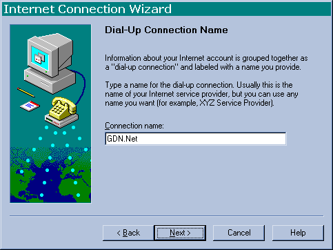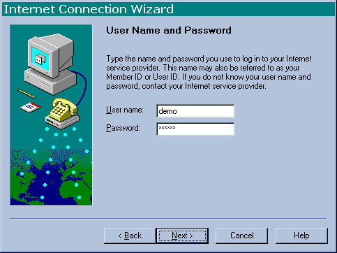 Your username and password are both chosen when you sign up. Both should be lower-case. 33.6k customers will simply enter their user name, example jsmith or demo. 56k customers must type their entire email address, example jsmith@gdn.net or demo@gdn.net When you are finished, click Next.